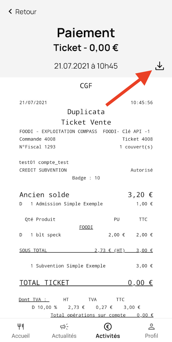 Cliquez sur l’icône “télécharger” pour télécharger votre ticket de caisse en format PDF.